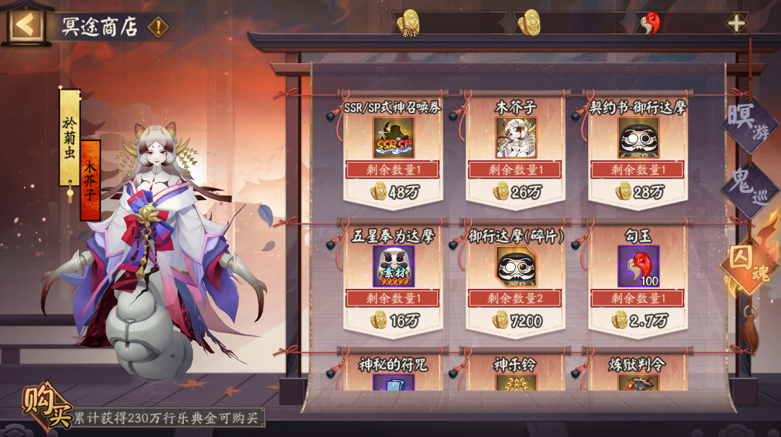 活动期间,阴阳师们可使用「行乐典金」兑换御行达摩、SP/SSR式神召唤券、於菊虫新皮肤·木芥子以及动态头像框「轮回之主」等奖励。