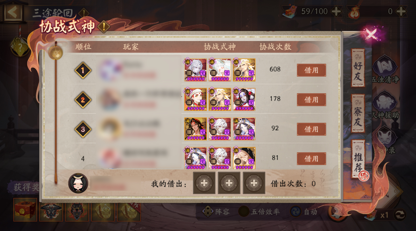 活动期间,阴阳师们可按需选择借入好友、寮友或推荐的式神协助挑战。协战式神只能在「三途轮回」中使用,不限上阵次数。