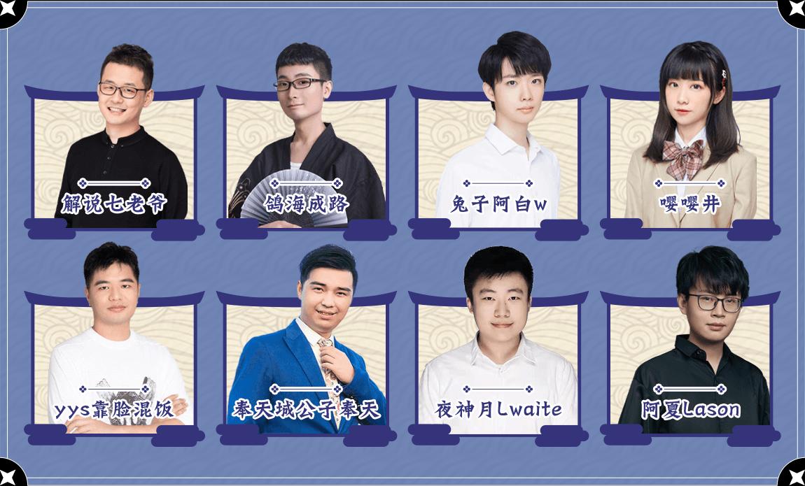 此次赛事邀请了8位知名解说鸽海成路、解说七老爷、yys靠脸混饭、阴阳师-夜神月、阿夏Lason、嘤嘤井、兔子阿白w、奉天城公子奉天,他们将为大人们带来精彩的赛事讲解!