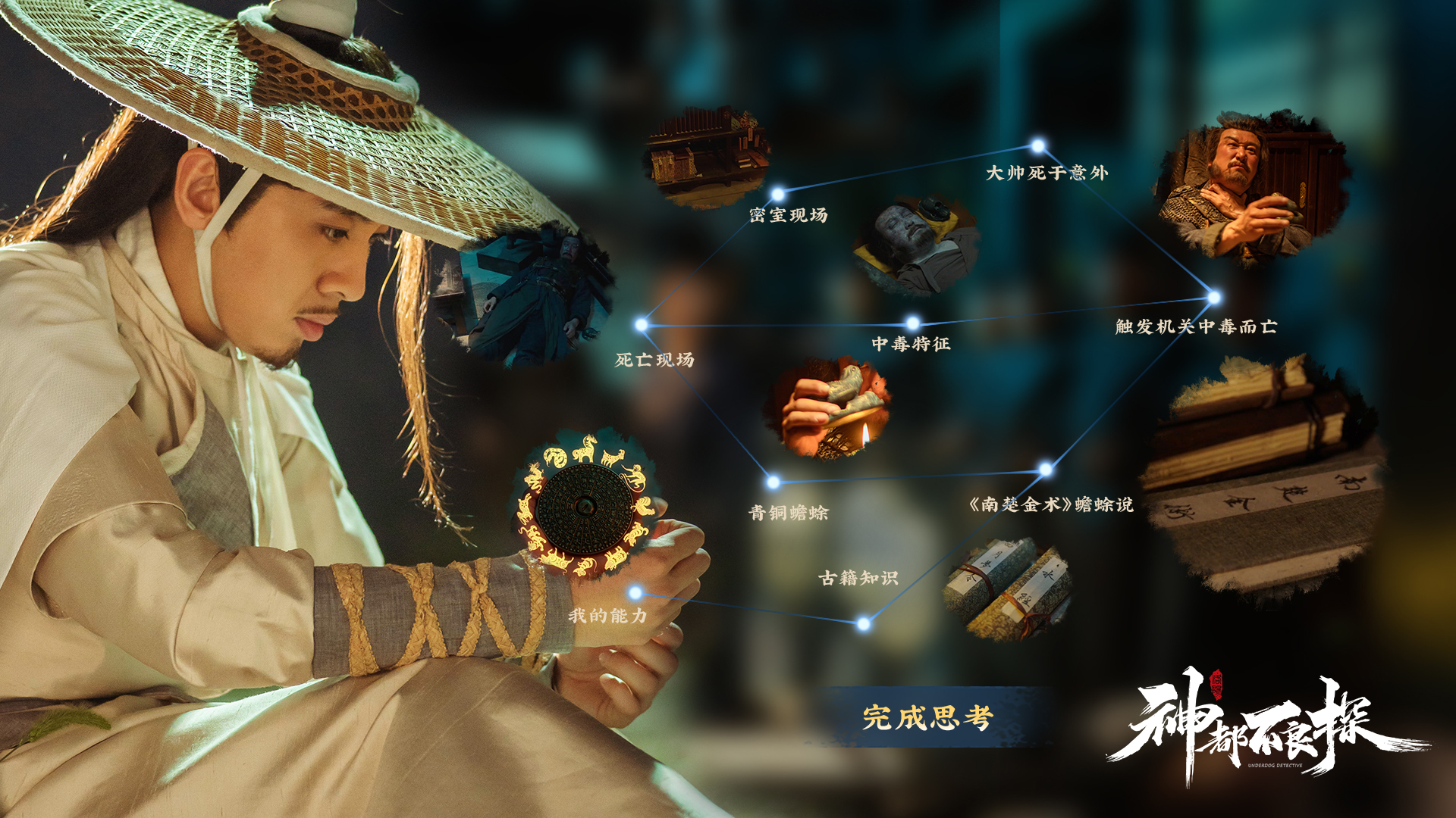 当你在案发现场,密室中收集了足够的线索,就会开启“思忖”模式,在脑海里梳理案件的导图:以每个已知的线索为起点,从中挑选有用的线索并对线索进行分析和延展,然后找出他们隐藏的共同点,最终关联成网,得出看似不可能却环环相扣的真相,推进剧情发展。