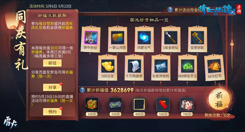 5月6日-5月23日,玩家可以在游戏内参与周年庆玩法领取丰厚奖励。周年庆活动期间,玩家可以通过每日祈福抽取现金及灵玉红包,更有周年庆专属头像框、珍稀时装、镜中府邸等海量好礼。玩家参与日常任务、周年庆活动或购买周年庆礼包均有机会获得周年庆礼券,并拥有抽取本服唯一坐骑【鹤传情】的资格。玩家可以通过参与日常任务赢得随机掉落的专属周年庆礼包,内含宝匣钥匙、金刚钻等珍稀道具。