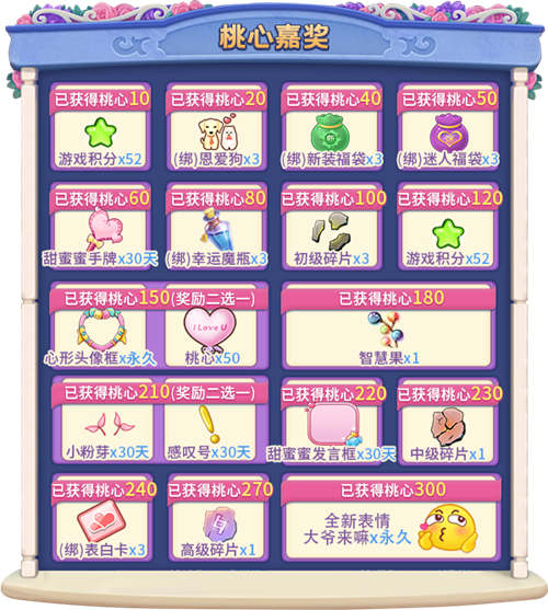 活动期间,完成游戏任务可获得“桃心”,在获得足够“桃心”后可领取桃心嘉奖!