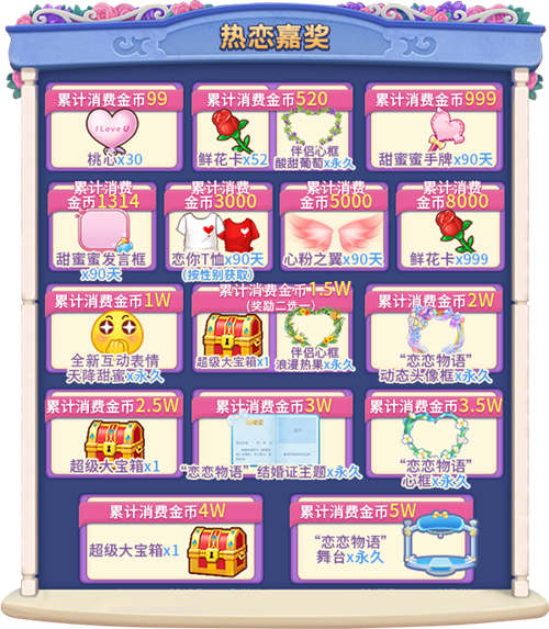 奖励三:根据玩家累计花费的金币,在“热恋排行榜”上进行排名,活动结束后为“热恋排行榜”上前10名玩家发放奖励!