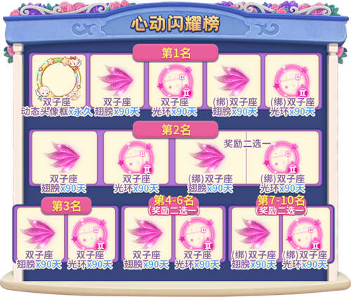 根据您在活动期间累计获得的心动值,在各自队伍内进行排名,活动结束后,为两支队伍的“心动闪耀榜”上前10名玩家发放奖励!