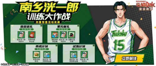 这次的活动开展期间将会是培养南乡的黄金时间段 !解锁南乡洸一郎、获得S评级都会获得对应的奖励。从获得南乡洸一郎到达成100%天赋解锁,玩家可获得海量的南乡洸一郎特训卡、技能训练卡、专属称号、潜能材料、特质潜能等奖励。玩转养成计划,快人一步解锁巅峰南乡,轻松称霸篮下!