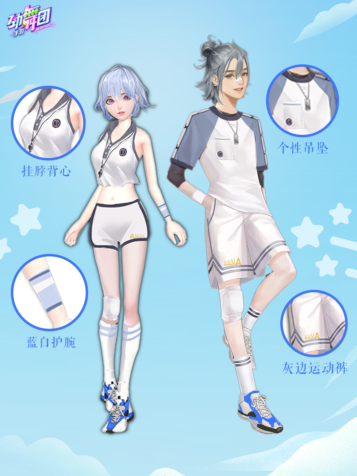 本期上新的活动服饰阳光男生/阳光女生,男女款服饰均以白色为基调,活力清爽、简约气质,夏日氛围感拉满!阳光女生采用露脐背心搭配运动短裤,脖间坠有口哨挂脖,手部戴有白色护腕,再配上蓝白配色的长袜与运动鞋,活力感满满,妥妥的青春美少女!穿上阳光女生服饰,来劲舞世界,一起挥洒汗水,舞动夏日吧!