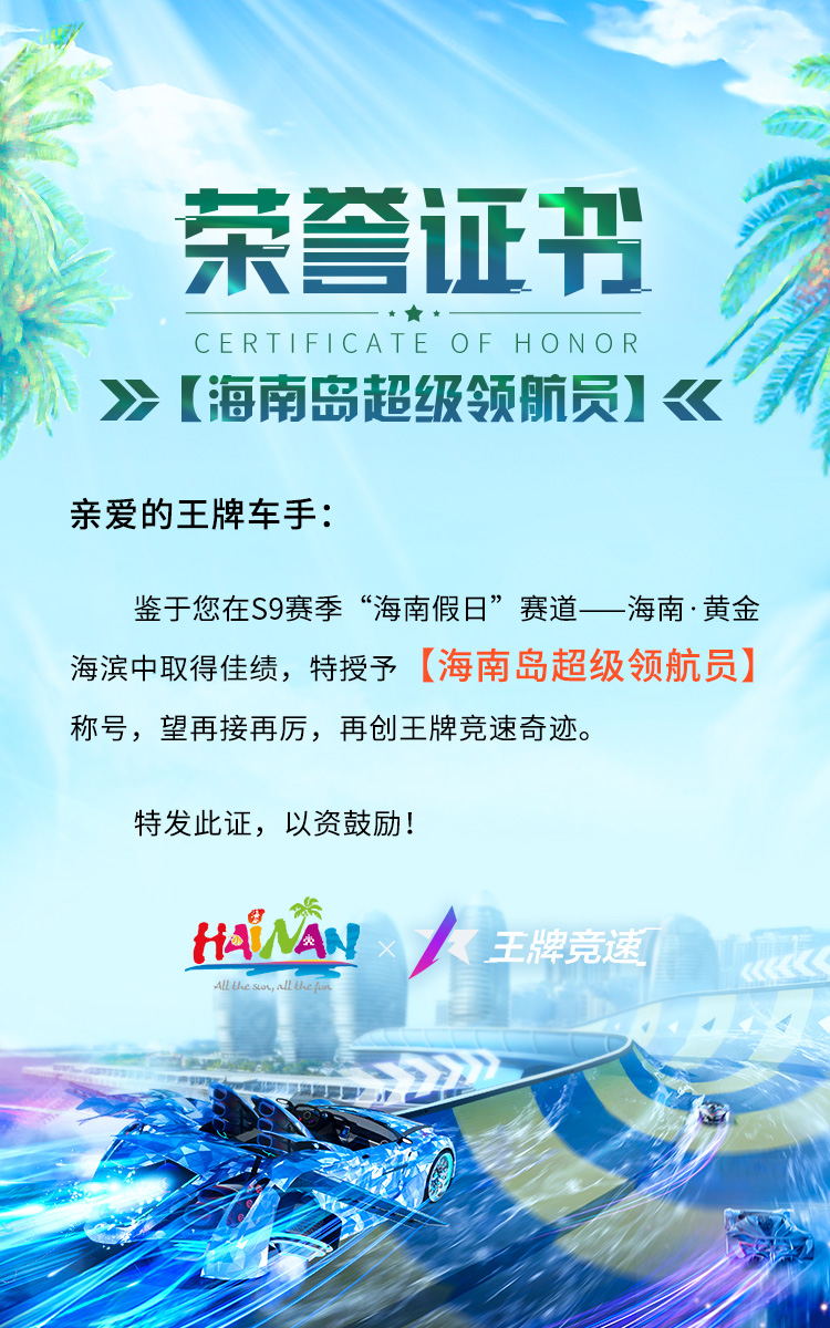 沁人心脾的海风不仅吹来了全新赛道,也在速度节上吹来了争做超级领航员的风潮!在本次夏日联动中,王牌竞速筹备组和海南省旅游和文化广电体育厅一道,为广大王牌车手们准备了颇具海南风情的专属称号,也期待车手们上线亲身感受海南风光,用竞速实力斩获“海南岛超级领航员”的限定称号!不仅如此,游戏内更有丰富的联动活动,免费获取主题头像框-蓝天碧海、海南主题车牌、十连补给券、盛夏专属外观币等诸多好礼,快上线体验吧!