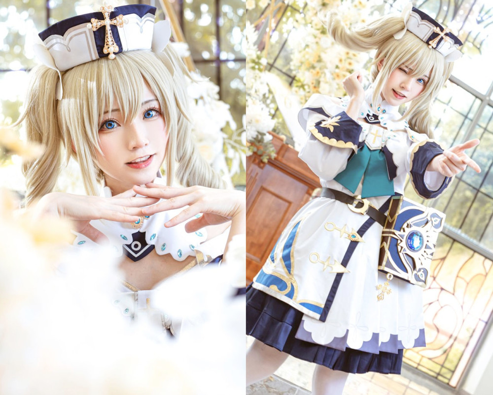 首先是闪耀的偶像明星芭芭拉,在游戏背景中,人人都爱芭芭拉,只要看到她心情就会变好,是一位不但能够治愈心情,还能够治愈身体的小天使。这位小姐姐本身长相便偏甜美,戴上金色卷发搭配深蓝色眼眸,人间芭比便是她了吧。那布灵布灵的大眼睛,还真的让人无法拒绝。
