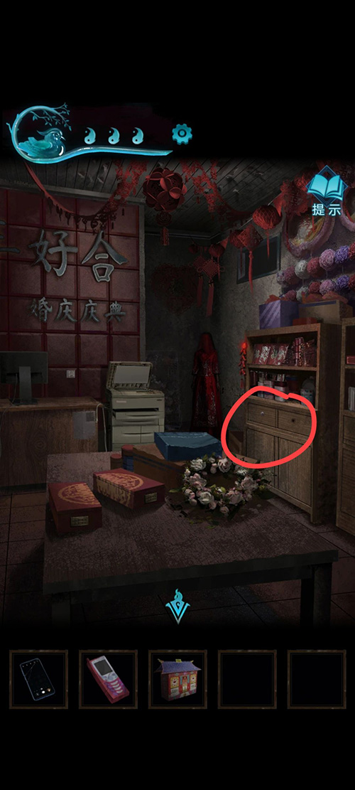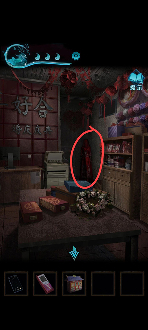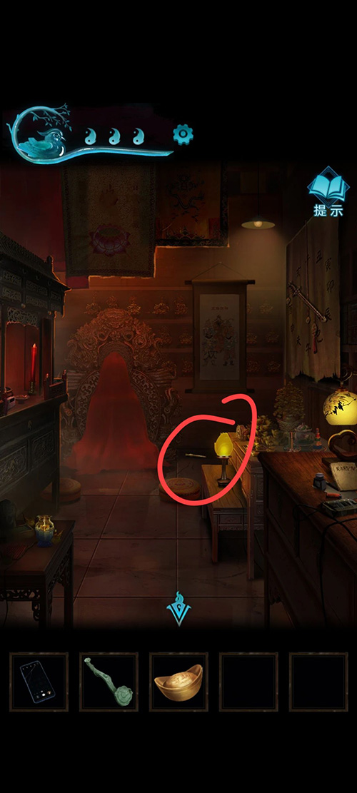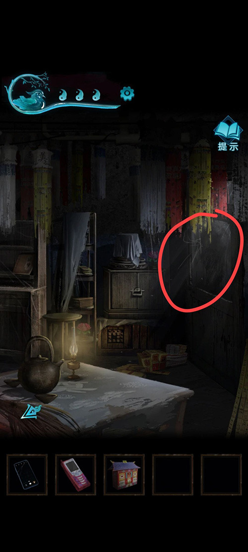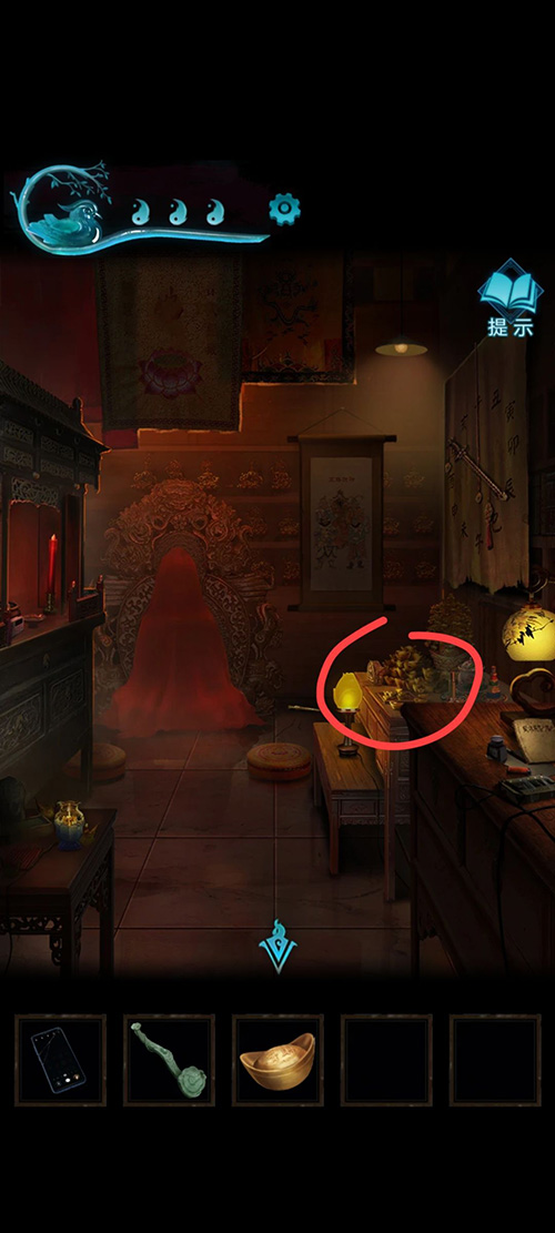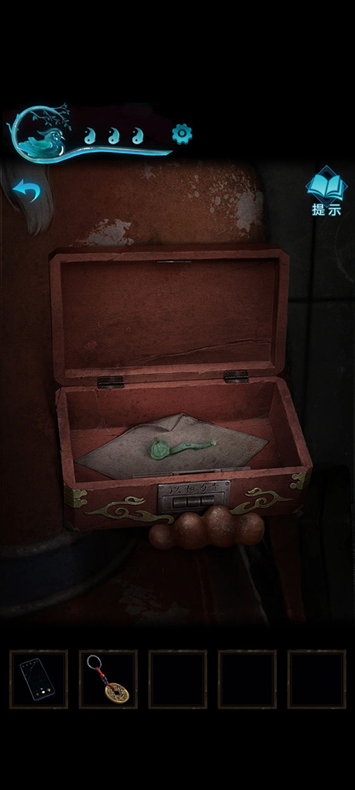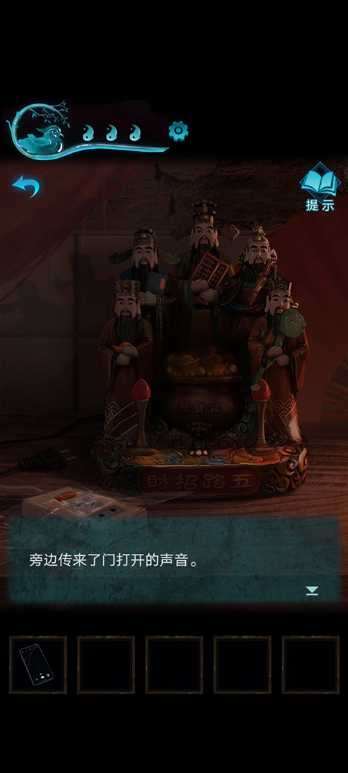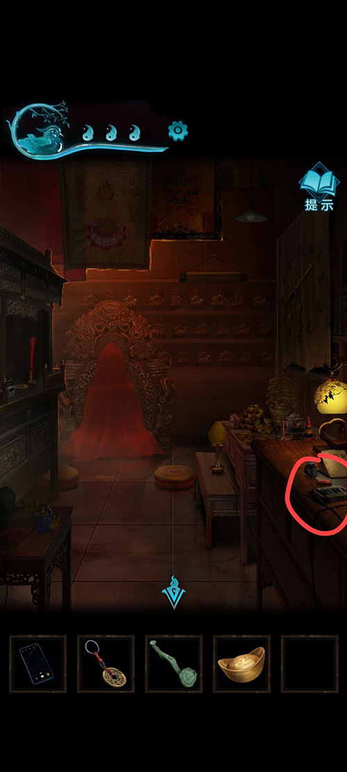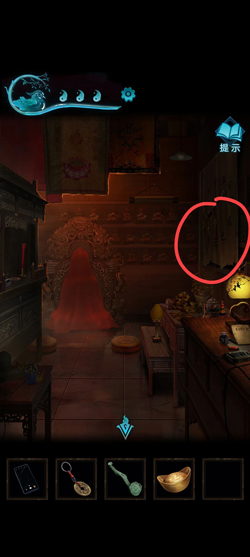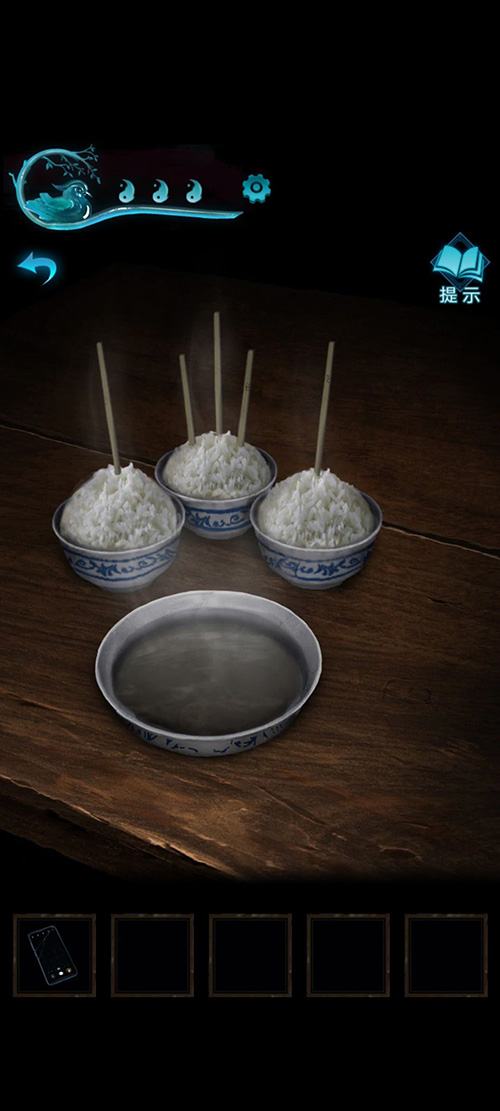 4、密码是“丧喜贺丧迎”,是桌子上的碗筷子的密码,然后点击空碗就会出现一个铜钱;