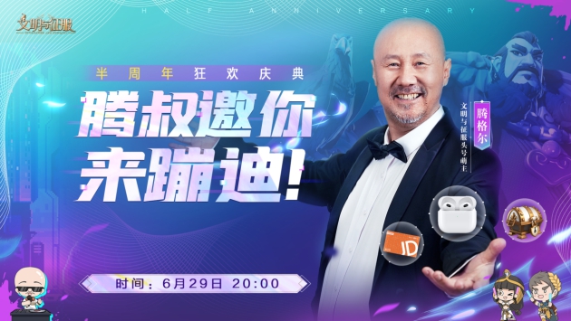 作为“头号萌主”,腾格尔大叔加入《文明与征服》,自然也带来了超多福利。6月29日直播当晚,搜索《文明与征服》B站&抖音官方账号,腾叔将在直播中化身DJ,带领各位领主嗨翻全场,同时还将为大家送出Airpods和京东卡等海量豪礼!