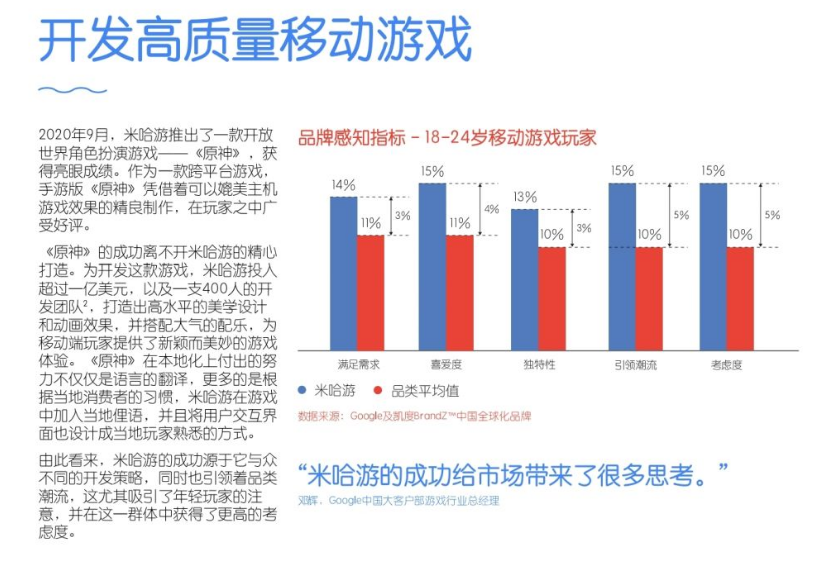 在这次报告中,谷歌还特意夸了一下米哈游,称原神成功离不开米哈游的精心打造,毕竟米哈游为原神投入超过一亿美元的研发资金和400人的开发团队,以与众不同的开发策略,引领品牌潮流,吸引了大量的年轻玩家。