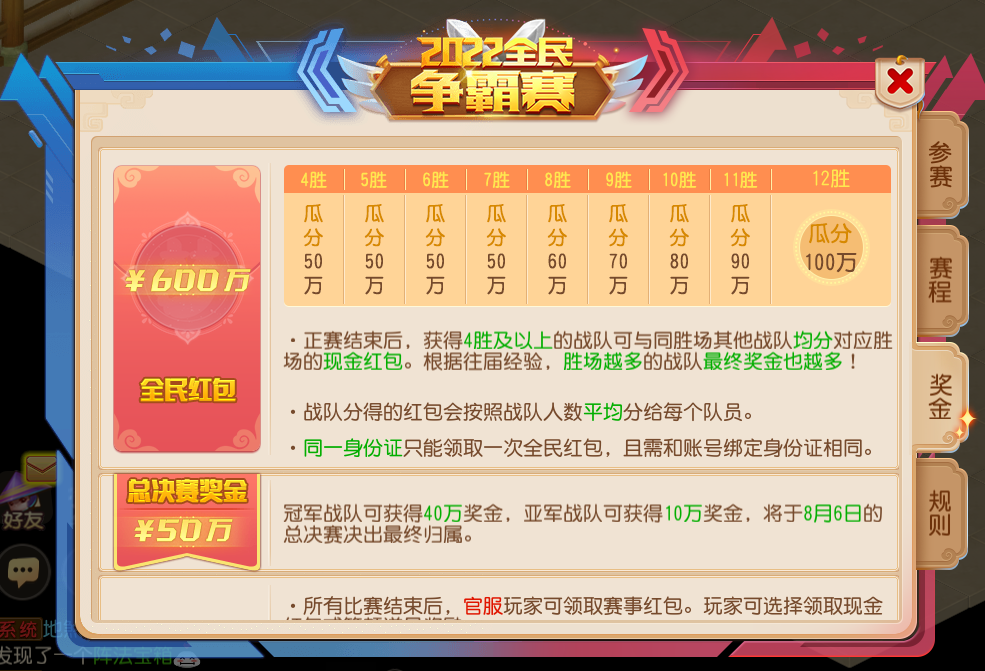 有别于往届全民争霸赛的是,本届赛事的奖励更加丰厚了!在正赛期间,取得四胜或以上的参赛队伍,将能与其他战队瓜分六百万的红包大奖!胜场越多的战队,最终得到的奖金也将越多!而在8月6日总决赛结束后,本届全民争霸赛的冠军战队将可获得四十万现金大奖,获得亚军的战队则将赢得十万奖金。