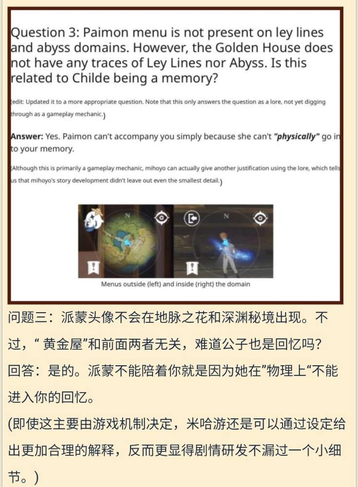 其次,细心的玩家应该发现了,打周本、地脉之花和黄金屋时,派蒙的头像不会显示在小地图上,这意味着此时派蒙并没有陪在我们身边。玩家说,这就说明虽然旅行者的回忆里有派蒙,但她却不能在“物理意义上”进入回忆陪伴旅行者。
