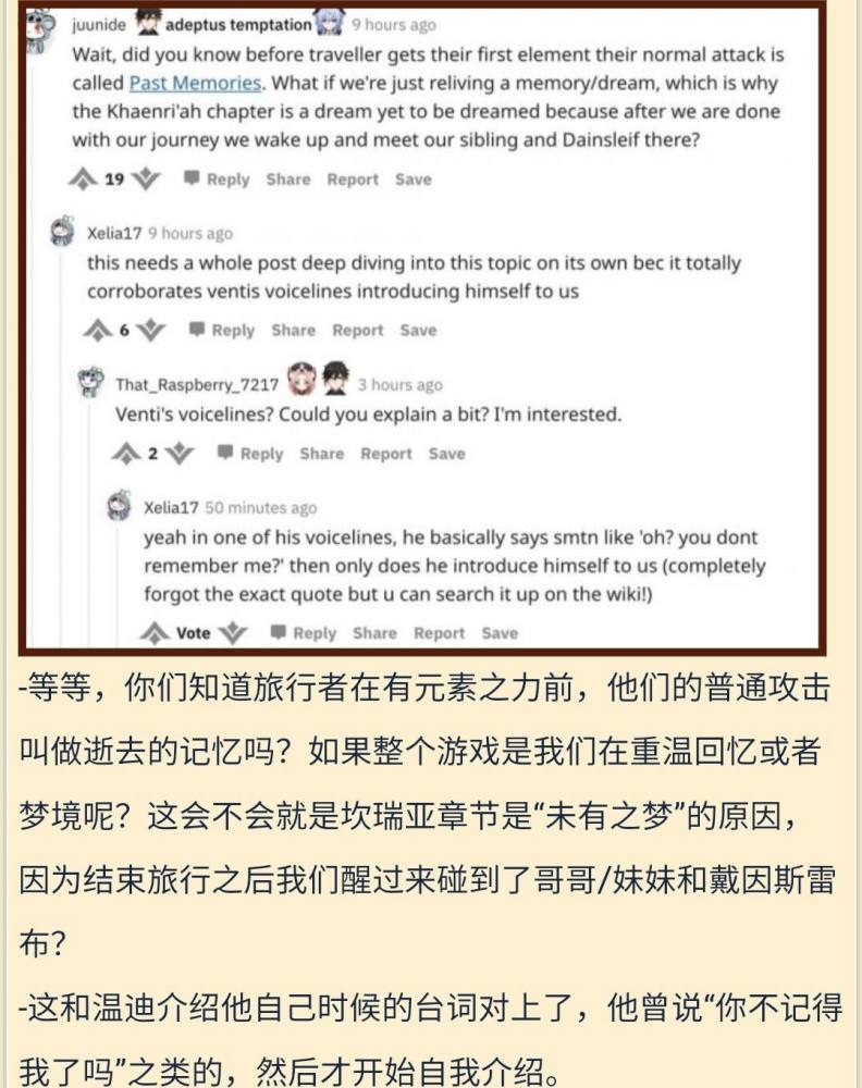 有玩家联系起其他的剧情文案:旅行者兄妹在获得元素力之前,他们的普通攻击名为“逝去的记忆”;而温迪在遇到玩家之后,也是先说的“你不记得我了吗”,才开始自我介绍。要是玩家曾经经历过提瓦特大陆上的一切,现在整个游戏都是玩家在重温自己的回忆或梦境呢?