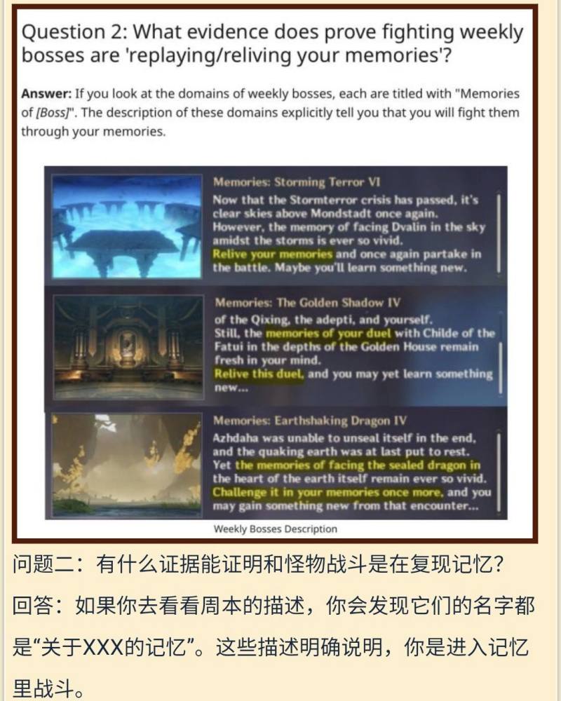 这位海外玩家还找到几个证据证明自己的观点:第一,周本的描述中已经点出,这是“关于XX的回忆”,这证明了旅行者是在记忆中战斗。