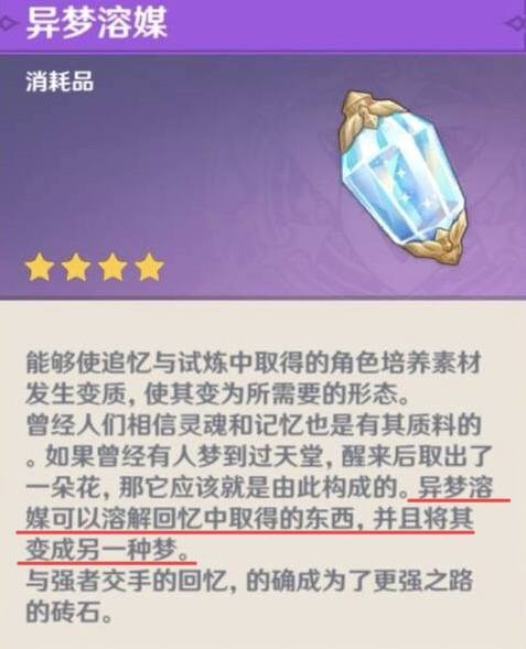 在1.5版本更新后,周常boss会掉落一种全新的材料“异梦溶媒”。相信很多小伙伴都和小编一样,对这个名字百思不得其解,这道具和梦有什么关系?但实际上,这个看起来中二风是有含义的,牵扯到整个剧情设定。根据这位玩家的分析,和周常boss战斗过程,其实是旅行者在重温自己过去的回忆,所谓的战斗也不过是一场“异梦”。