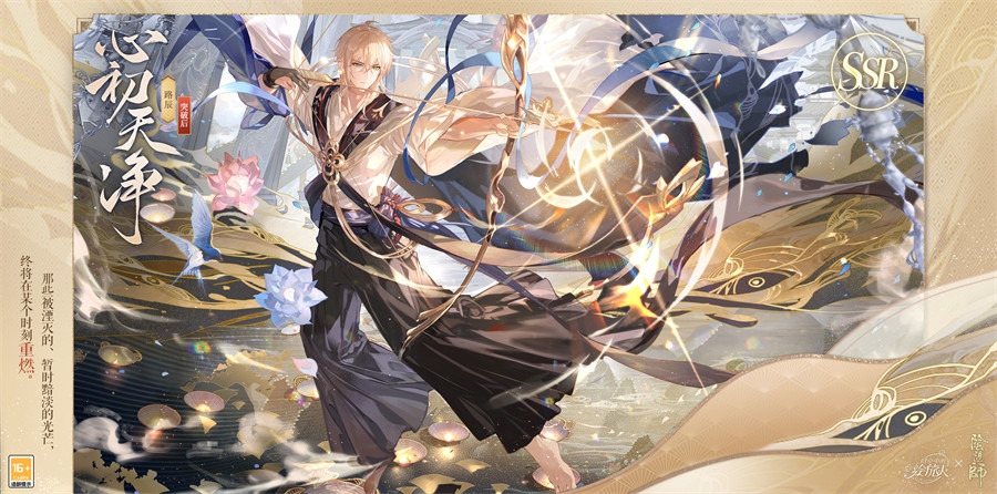 SSR画灵【心初天净】属特殊联动画灵,具备获取时台词特别展示;突破后具备横幅卡面、【流光】效果,可设为登录界面。