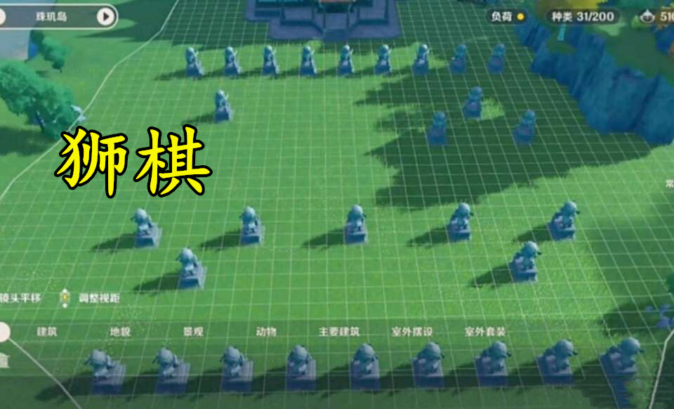 狮棋:这位原神玩家也是在开荒早期建造了“石材厂”,后来百万雄师没了用武之地变成了摆设。不过这位玩家摆得还挺有意思,看起来就像是摆了一幅象棋一般,所以起名叫《狮棋》。
