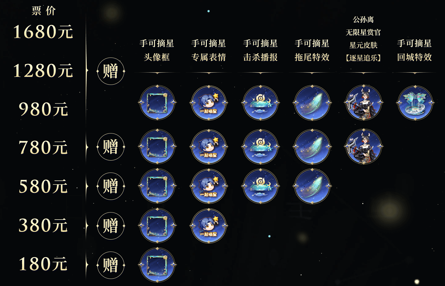 以上游戏道具在音乐剧巡演期间,仅可通过购票渠道进行获取, 未来“逐星追乐”星元部件将上架商城点券售卖,“手可摘星”系列回城特效、击败特效、拖尾特效 和 头像框、荣耀播报、表情 将在商城通过礼包形式上架抽奖获得!