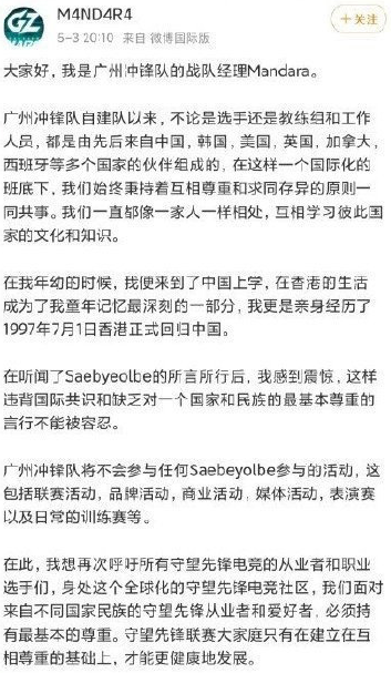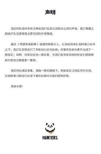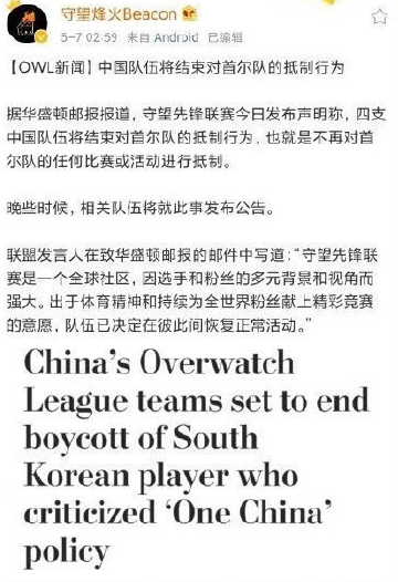 截止到五月七号,国内四支队伍以及首尔王朝队同时发表了一篇声明,模板完全一模一样,内容放在下面,大家可以一起看一下。同时华盛顿邮报指出,中国守望先锋队伍将结束对SBB选手的抵制。