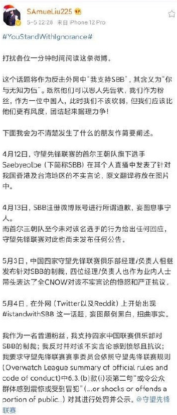 此事件过去一个月有余,首尔王朝队官博终于转发了SBB选手的道歉信,但是IStandWithSBB依旧挂满了国外直播平台, B站的直播间也依旧在继续打压国内观众的发生。这件事情真的结束了吗?显然没有,只是守望先锋希望让这件事平息,你继续赚国内玩家的钱。