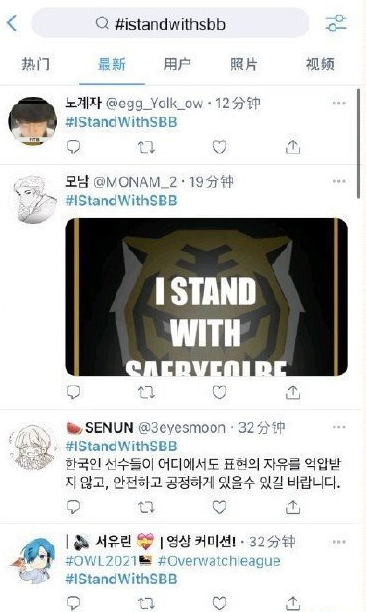 国内的玩家纷纷对队伍的表态点赞,但是国外网站却呈现完全不同的另一幅景象,以韩国粉丝为首的观众在中国俱乐部的官推下面公然抵制、辱骂,仿佛SBB才是受害者一样。甚至还专门建立了IStandWithSBB的话题,表示支持SBB的做法。