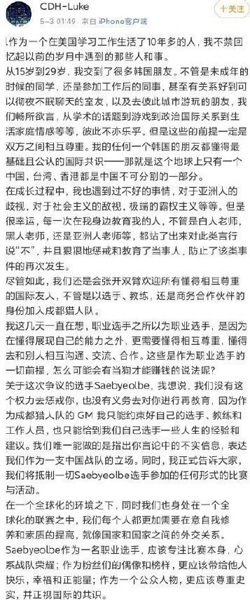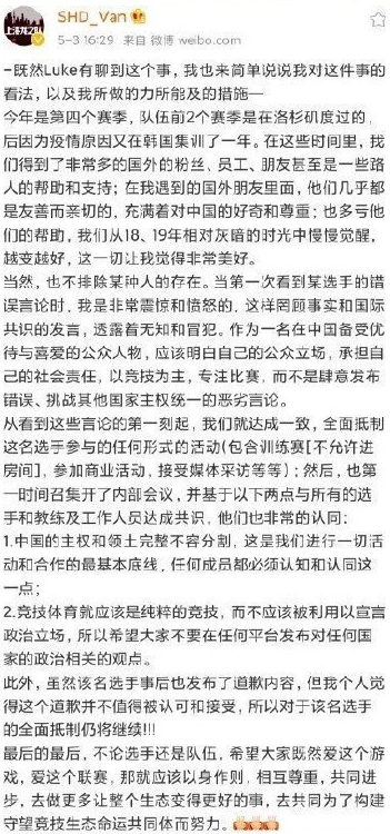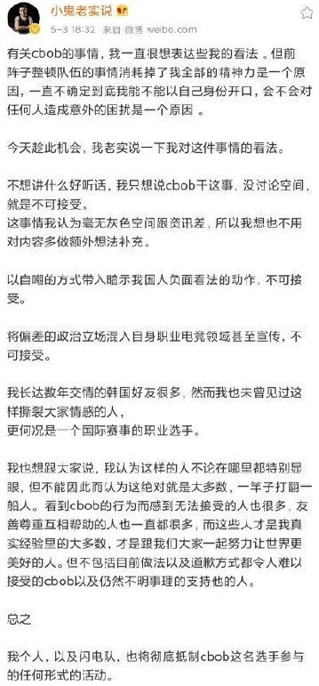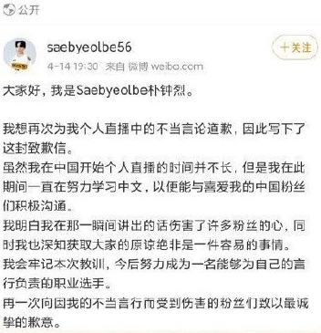 这么一段话代表了什么意思,相信不用多说,看过的观众都能做到心中有数。这样的言论引起了国内非常多玩家的不满,并因此开始抗议,之后多位业内相关人员发微博表示不满,但是最后都被删除了。之后SBB迫于舆论压力,专门注册微博发了道歉声明,但是首尔王朝队以及所属的GenG俱乐部并没有对此进行任何发声。