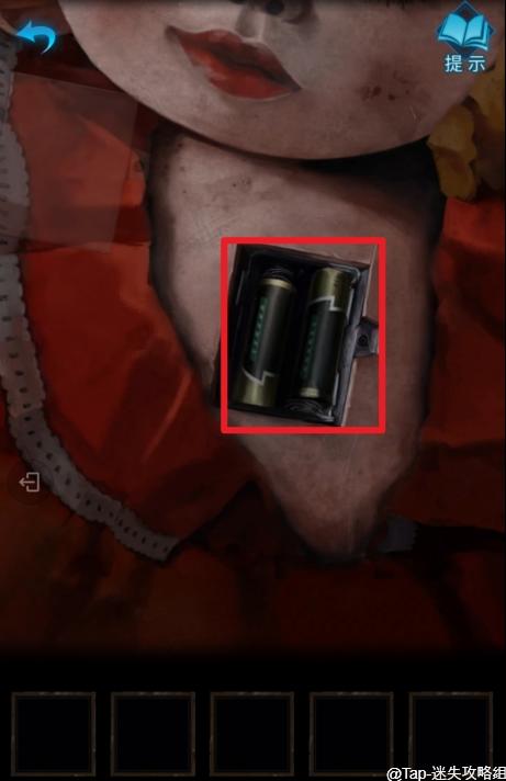 15、回到客厅,点击挂历下的柜子,打开下面的柜门,使用【铜指甲】打开洋娃娃身上的螺丝,得到【电池】。