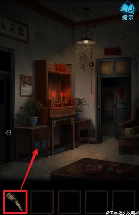 8、返回客厅,点击神龛右边的柜子,使用【钥匙】打开柜子,得到【老虎钳】。