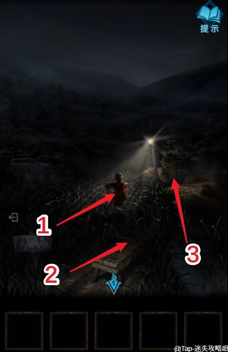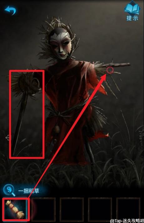 10、走出院子,点击地里的稻草人得到【飘带】,使用铡刀将【飘带】斩断(进行一段剧情后才能用),成【三段飘带】,使用【三段飘带】捆绑旁边的稻草,得到【一捆稻草】,最后使用【一捆稻草】修复稻草人,得到【火钳】。