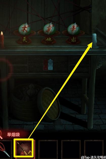 27、使用火柴点击左边红蜡烛,转换女主视角,使用【旱烟袋】点燃右边白蜡烛。