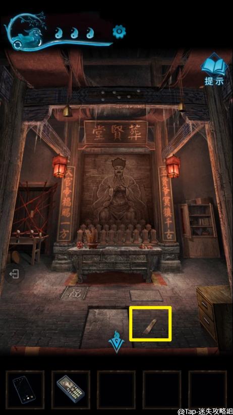 13、进入宗祠,点击地面刻字地板,再次点击字,得到线索如图93.1。