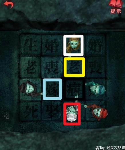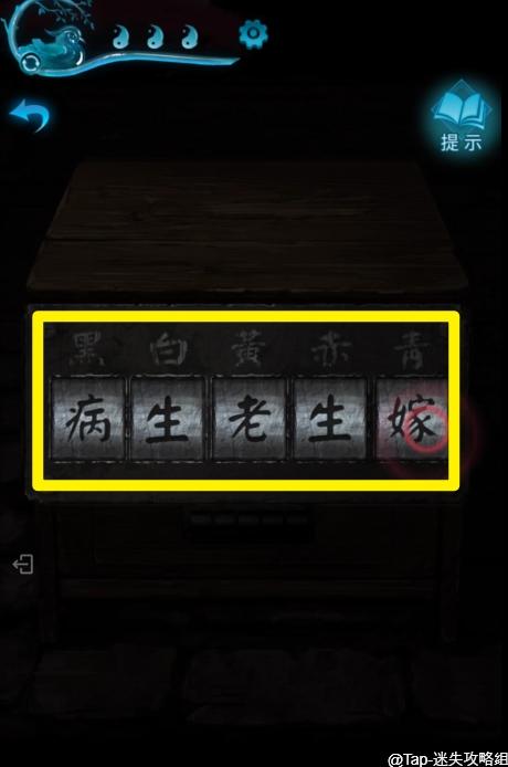 15、进入宗祠,点击右边的箱子,在下面的密码锁中输入密码:黑-病、黄-老、红-生、白-生、青-嫁,得到【磁勺】。
