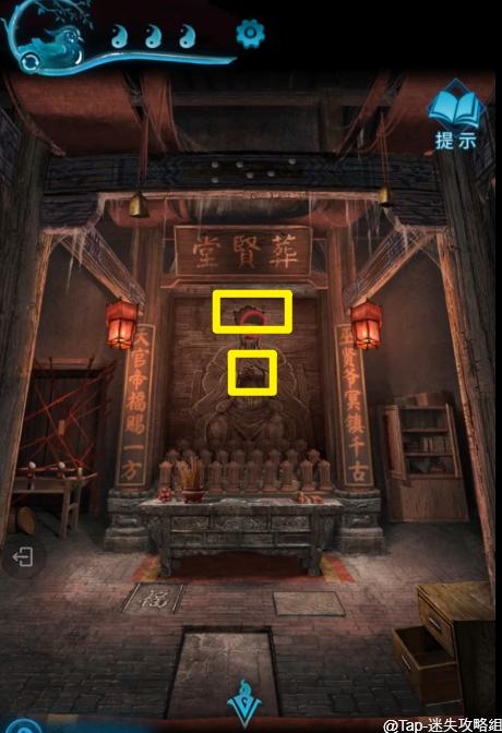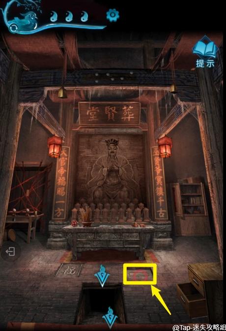 18、进入宗祠,将【石笏】和【石冠】放在正中央的雕像上,打开地下通道的机关。