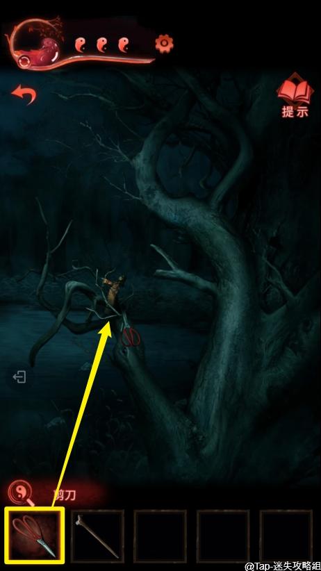 10、返回野外小道,使用【剪刀】取下树上的【皮影】。