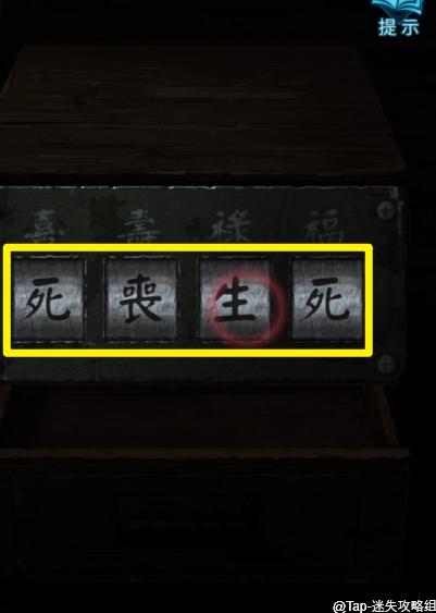 21、观察地板上的图案,得到密码线索(此处需要男主视角在上面切换“福禄寿喜的地板,女主在地下观察地面灯光照到的文字变化,记住每个字对应的图案,根据《寿祭》中记载选择每个图对应的字,如图101):福-死、禄-生、喜-死、寿-丧。