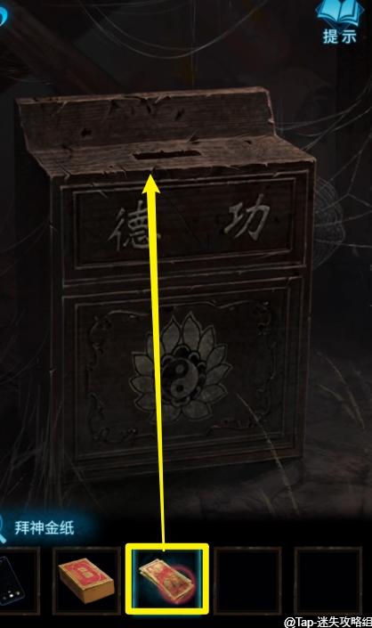 24、来到庙中,点击左下角的功德箱,将【拜神金纸】投入功德箱,查看水官画像,得到【阳喜字】。