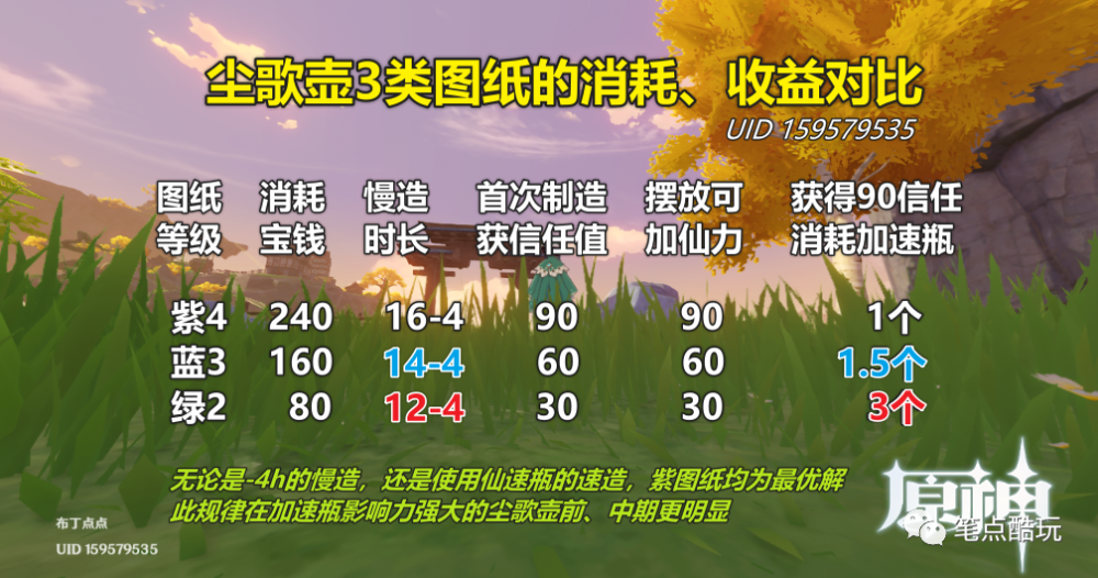 讨论仙力、信任值产出,三种图纸的确没有区别,但你没有意识到的问题是——信任值必须制造图纸完成后才会增加,而制造时间却可以用加速瓶完全跳过——紫图一次加速就可以拿到90仙力+90信任,蓝、绿图想要拿到相同的仙力和信任值,却要消耗1.5个、3个加速瓶,由此可见,紫图纸+加速瓶产出更快,积攒仙力、信任值当然紫图为先。