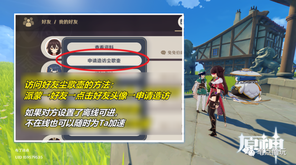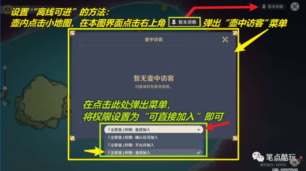 【点点详解】首先你要有一些积极玩尘歌壶的好友,然后将自己的尘歌壶设定为“离线可进”,这时无论你在线与否,好友都可以随时访问。让好友都开启“离线可进”,随时互访,日常加速无忧。