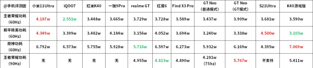 然后是游戏功耗,这次K40游戏版的优化还不是很完善,吃鸡功耗只有3.1w,但原神竟然达到了7w,远超一种骁龙888手机。如果只玩王者和吃鸡续航还不错,但玩原神就有点崩了。