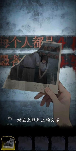 21、在柜子里面可以得到半张残缺的照片,照片上有过道墙上剩下的字迹。