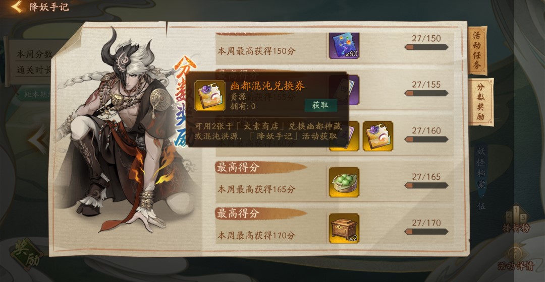 对于实力有待成长的新手降妖师来说,无需强求完成所有关卡或叠加BUFF,因为本次活动准备了活动任务奖励、积分奖励和排行榜奖励三重好礼,活动任务奖励中,完成每个大关卡里的前三个小关卡就能够获得足够丰厚的奖励,而积分奖励中最关键的道具-幽都混沌只需160分即可兑换,即使放弃2个小关卡也无妨,如果你在难度较低的前两个小关卡里叠加了适当的BUFF,那么即便3个大关卡的第5小关卡全部放弃,依然足以兑换幽都混沌。