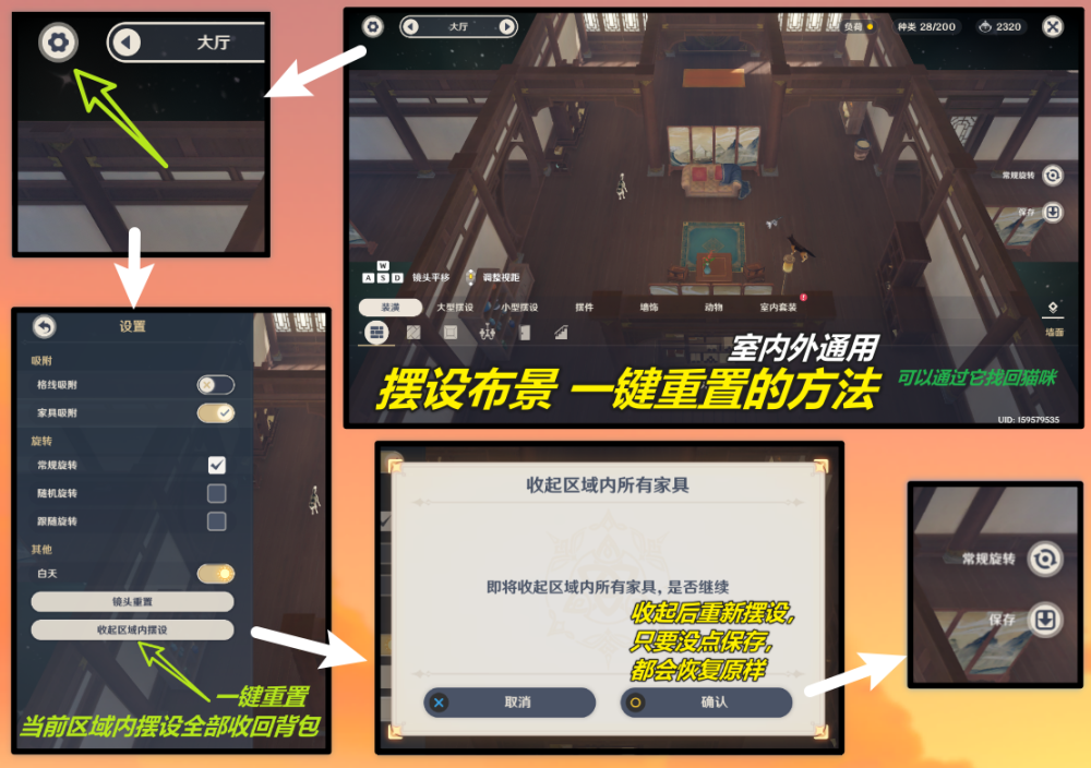 注意,一键重置是收回已经放入场景的所有摆设。重新布置满意后保存即可,不满意不保存,会恢复上一个布局。注意,该“重置”只影响当前所在区域,比如对二区域重置,主区域、室内摆放都不受影响,你也可以随时切换不同场景连续“重置”、调整。