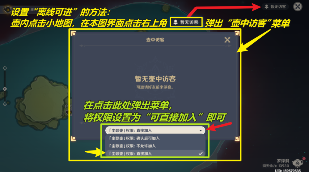 如何设置“离线可进”?首先点开小地图,在壶中地图中点击右上角,就会出现3个选项,选择这个访问方式就可以了。