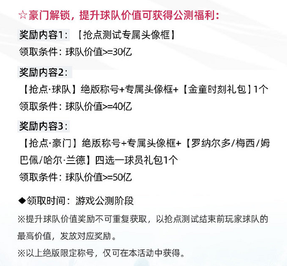 礼包4:豪门解锁,提升球队价值达到30亿、40亿、50亿,将可获得【抢点测试专属头像框】、绝版称号和限定礼包奖励,绝版称号只能通过本次活动获取,各位经理可千万不要错过了喔!