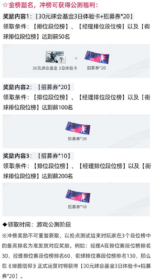 礼包2:金榜题名,冲击【排位段位榜】、【经理排位段位榜】、【街球排位段位榜】达到前200名、100名、50名,可以按名次获得30元球会基金3日体验卡、招募券等奖励!