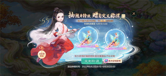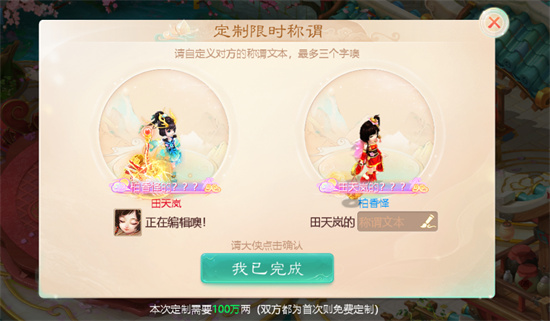 活动期间,两位均拥有了“七彩祥云随身特效”的侠士,还可组队前往“朱茵”处定制自定义双人称谓、领取浣彩露奖励。