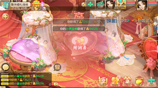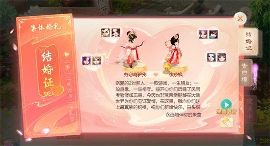 3、结婚流程由“茵缘仙子”朱茵主持,在集体婚礼中,所有玩家将会体验到小剧场、红包雨、拜堂、撒喜糖和闹洞房等一系列有趣的婚礼内容,最终在一切趣味的体验中缘满结束;