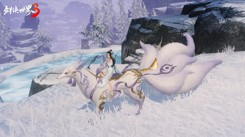 寒山寂夜拂霜晓,三千须弥入吾怀。双人坐骑「晓霜若云」灵感来自于九尾灵狐,通体雪白,淡紫飘带增添灵秀,黄金铠甲凸显贵气。灵狐陪伴,诸位少侠可畅游天地之间!