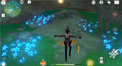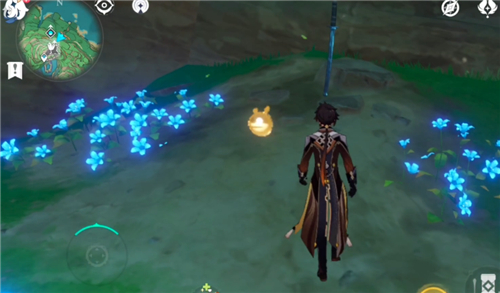 跳到底部,会看到这里有很多蓝色荧光的小花,走到尽头有一把插在地上的剑。